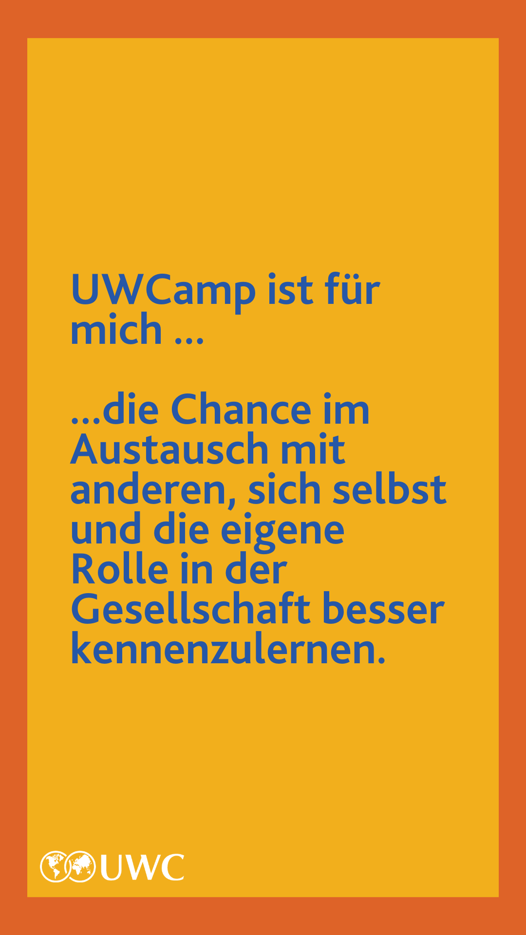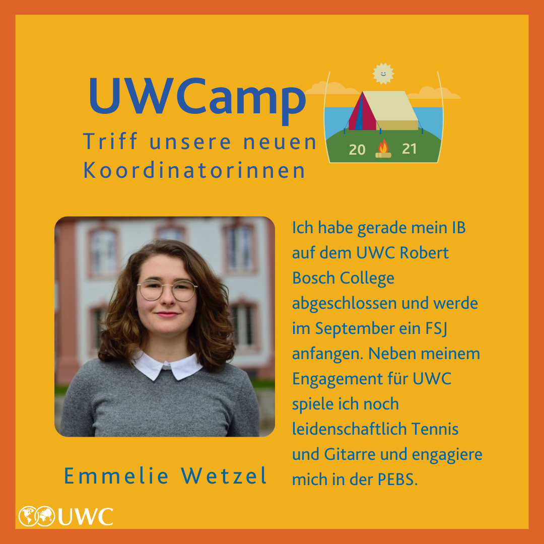 Unter diesem Motto findet im Herbst 2021 das UWCamp statt. Das Fellowship-Programm UWCamp ist ein einjähriges Angebot für Teilnehmer*innen, die in Deutschland zuhause sind und verdeutlicht die Vielfalt in der deutschen Gesellschaft. Das Angebot findet, im Gegensatz zu den UWC Short Courses, ausschließlich auf Deutsch statt.