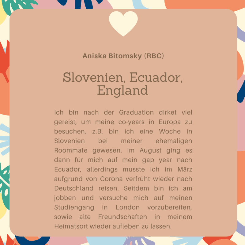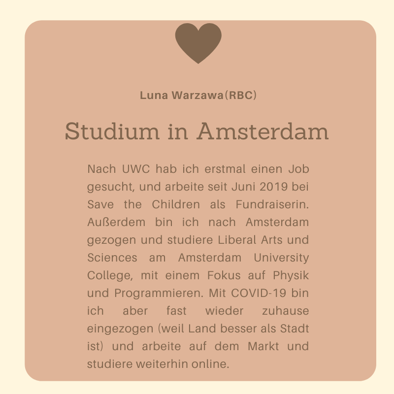 Ein Jahr nach ihrem Abschluss haben wir uns umgehört, was die UWCler*innen des Jahrgangs 2017-19 inzwischen machen. Hier erzählen euch 22 Absolvent*innen wo sie inzwischen leben und was ihre Zukunftspläne sind: