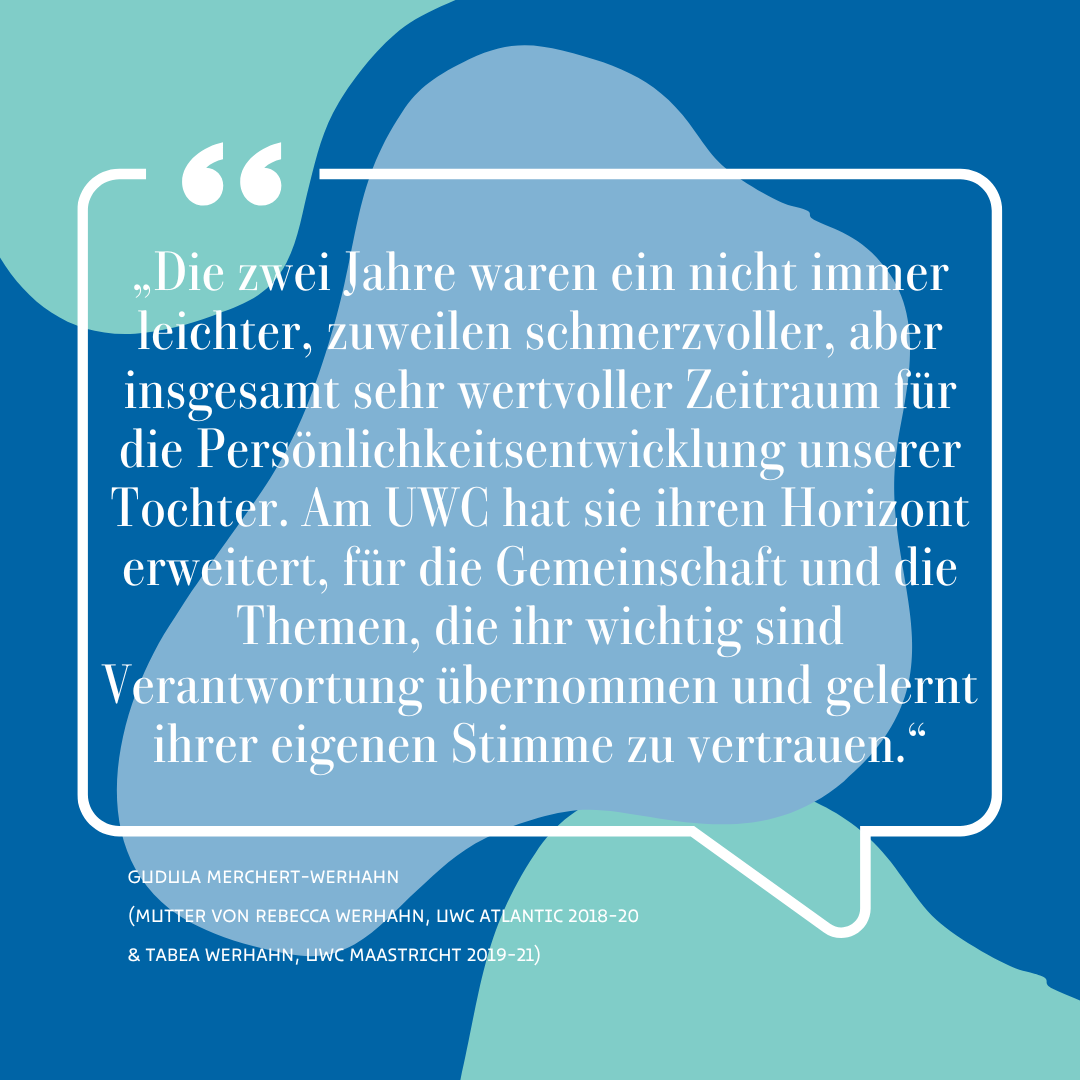 Falls darüber hinaus während des Bewerbungsprozess oder nach erfolgreicher Platzzusage Fragen oder Unsicherheiten aufkommen, bieten wir Ihnen die Möglichkeit, erfahrene Eltern, die schon Kinder auf einem UWC hatten, zu kontaktieren und mit ihnen in einen persönlichen Austausch zu treten. Dafür können Sie sich mit Ihrem Anliegen an folgende E-Mail-Adresse wenden: Eltern@uwc.de.